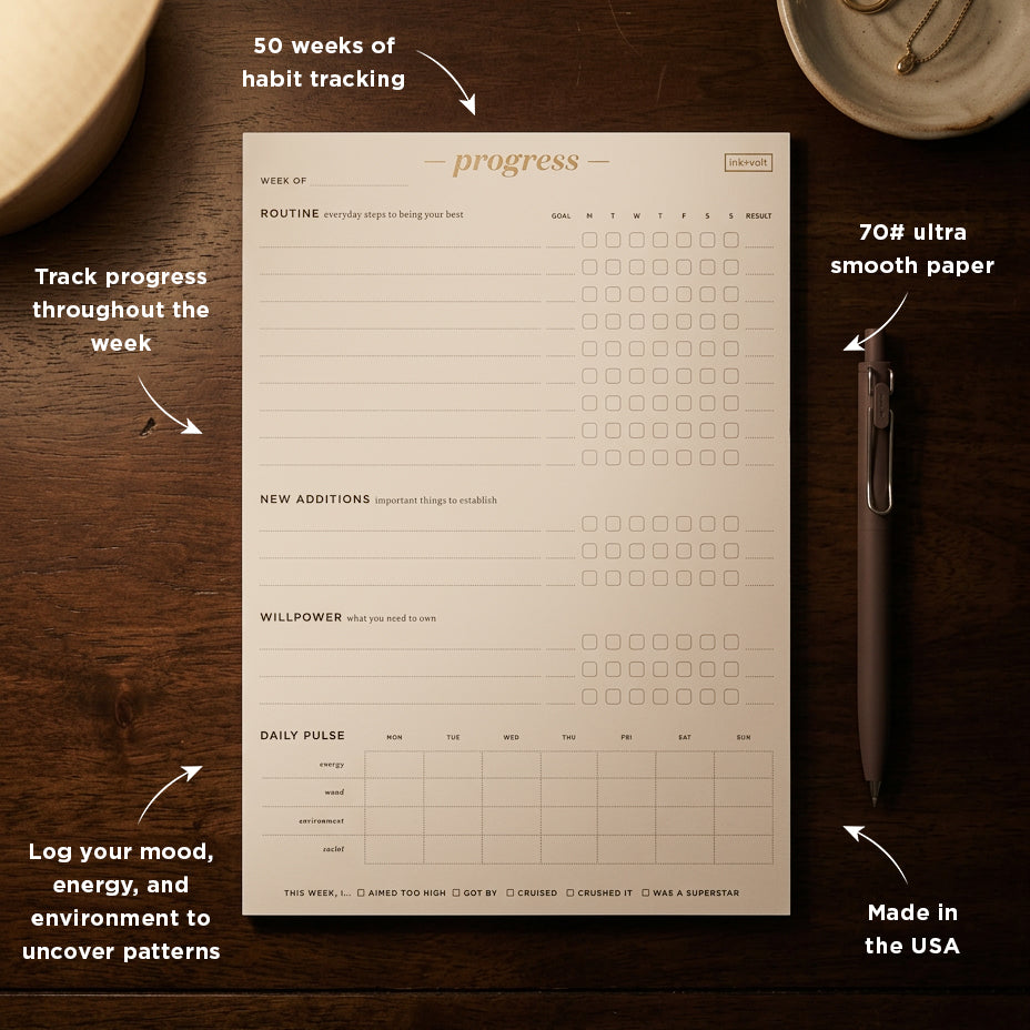 The Ink+Volt Progress Pad is the ultimate tool for tracking your habits, new and old, and inspiring consistent progress toward your goals. The pad features a 7-day log that allows you to track everything from the routine to-dos to new and more challenging activities, behaviors, or practices you want to establish and strengthen, or stop.