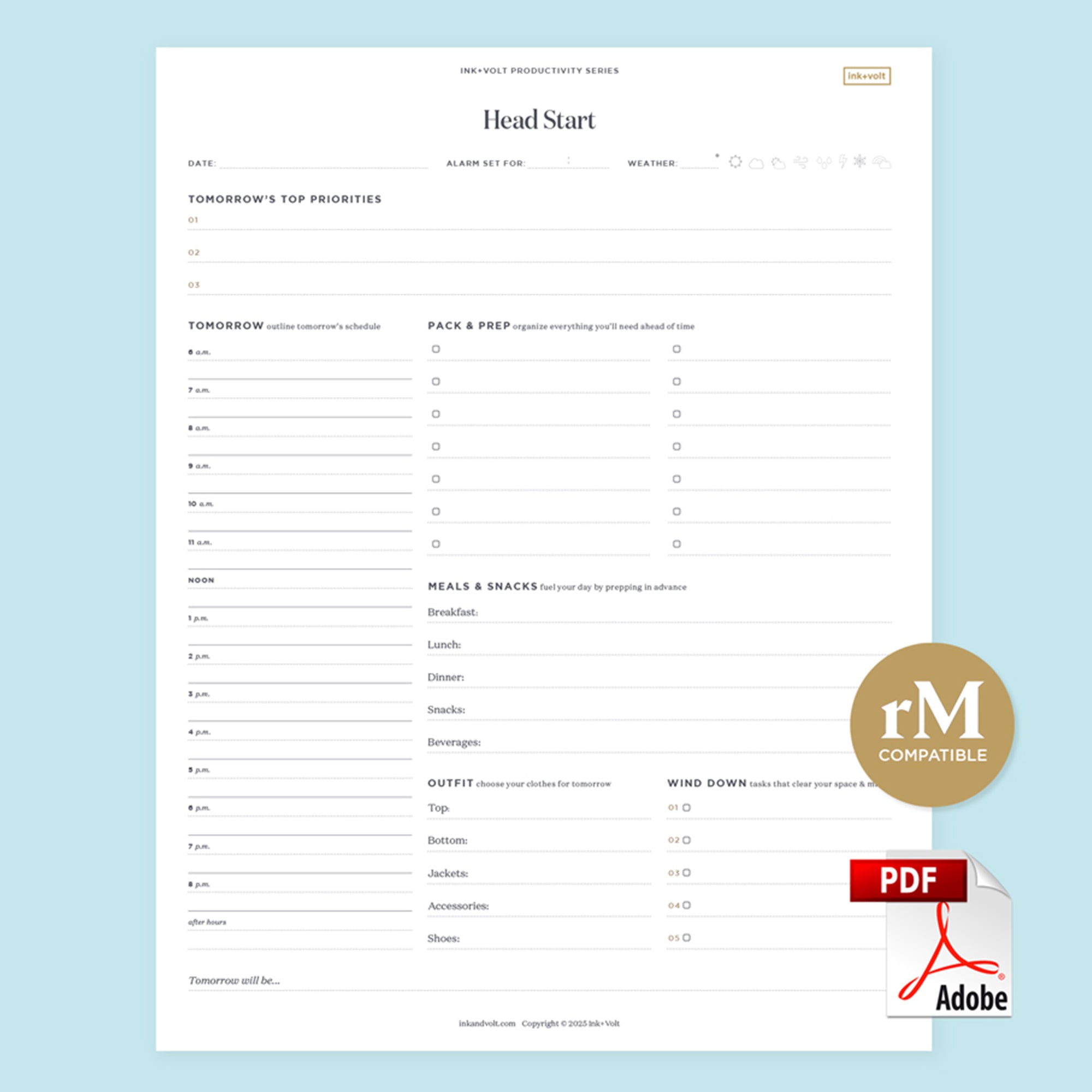 Whether you're preparing for a busy workday, a full schedule with your family, or simply aiming to sleep better with less on your mind, the Ink+Volt Head Start Digital Worksheet guides you through every step of a thoughtful nighttime routine:
