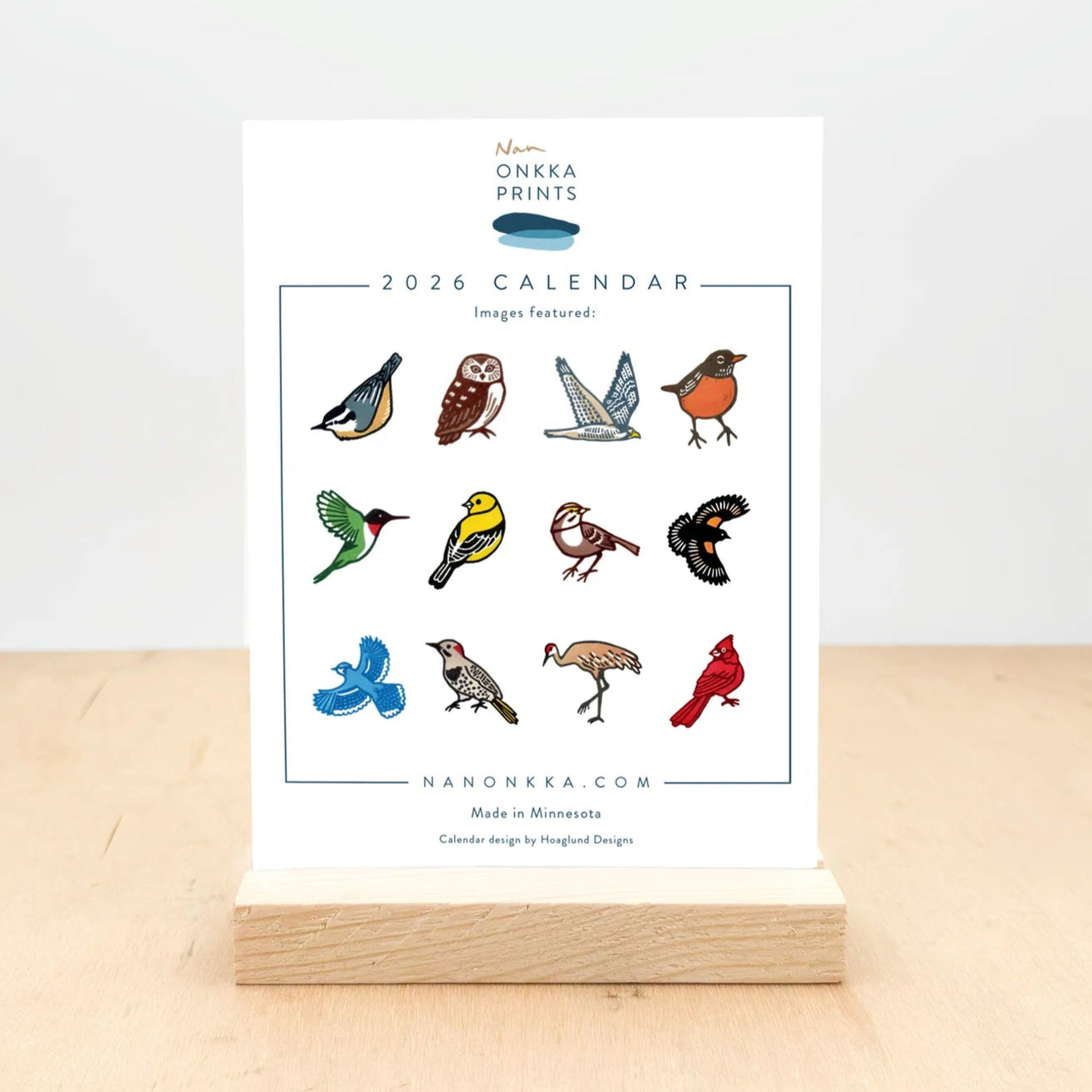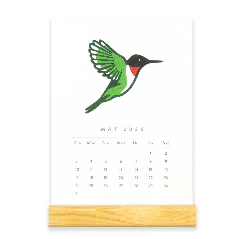 Bring color and charm to your space in 2026 with this handmade desktop calendar. Each month showcases a vibrant woodcut print by Minnesota artist Nan Onkka, whose work is inspired by the serene beauty of the northern wilderness. From the bold reds of a cardinal to the delicate grace of a chickadee, these twelve unique prints will uplift your mood and workspace all year long.